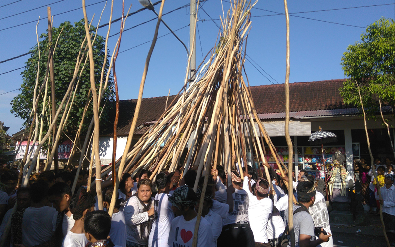 During the ceremony. Villagers are divided into several groups of 50 people, where each participants brings a 2.5 meters pole from a skinned branch, so they can stick so many involved, the sound of the poles hitting each other is quite loud, creating the sound of “tek” (indonesian spelling of imitating the knocking poles’ sounds), and thus is why this ritual is called “Mekotek”. The participants will be all wearing Balinese attire especially Udeng.